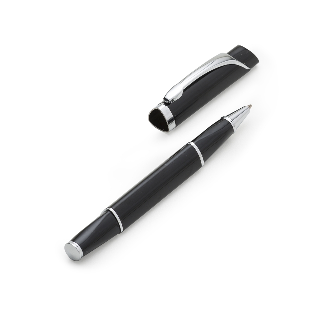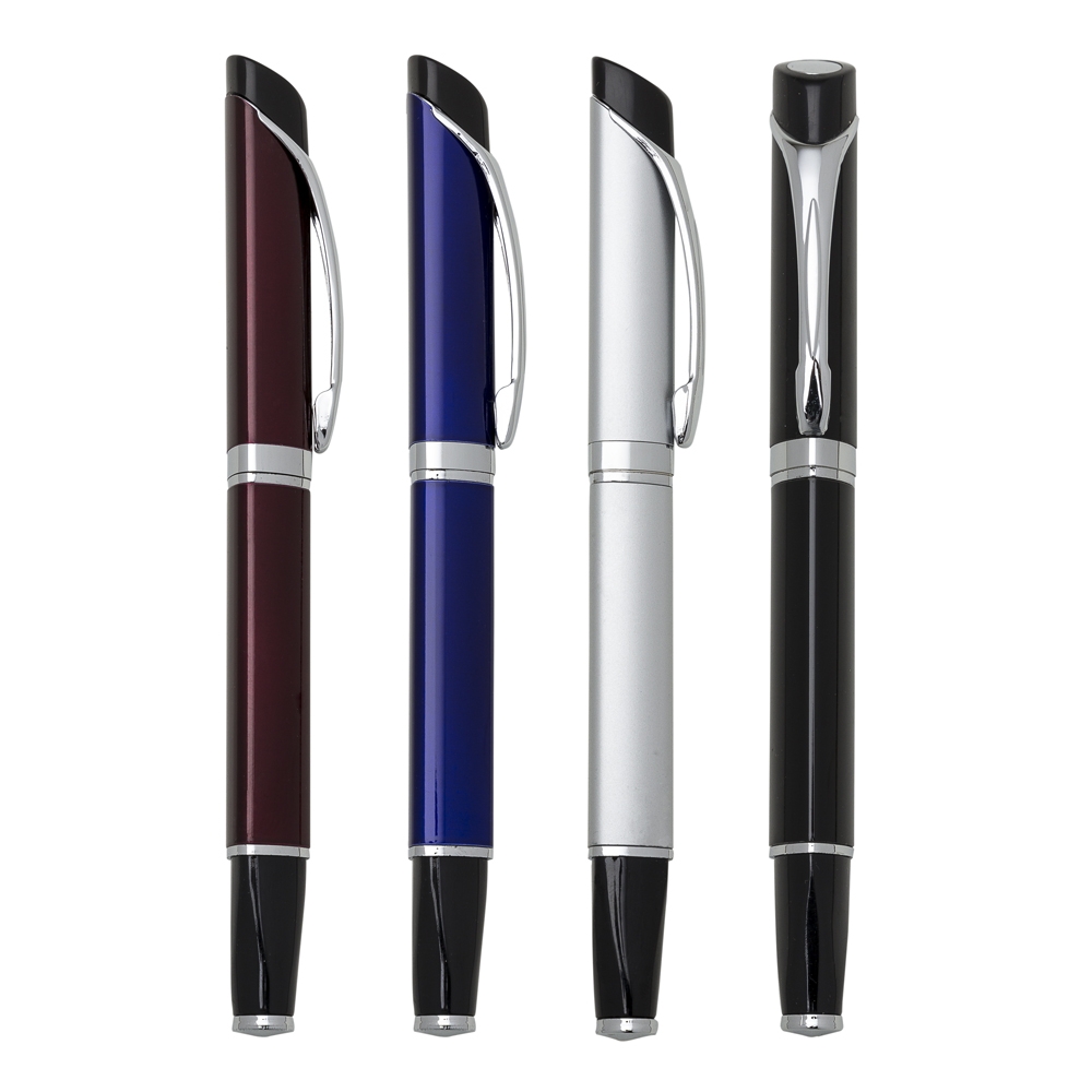 Caneta metálica triangular com tampa, carga esferográfica azul.