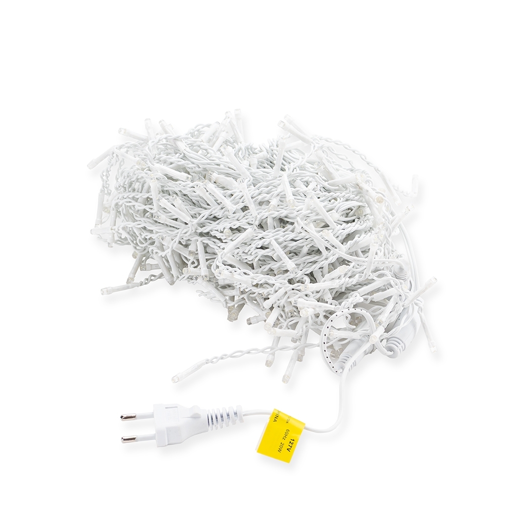 Pisca-pisca com iluminação em LED. Possui 400 lâmpadas dispostas em formato cascata ao longo de cerca de 10 metros de cabo, além de cabo de alimentação de 127V e adaptador que permite conectar o pisca-pisca com outros conjuntos compatíveis.