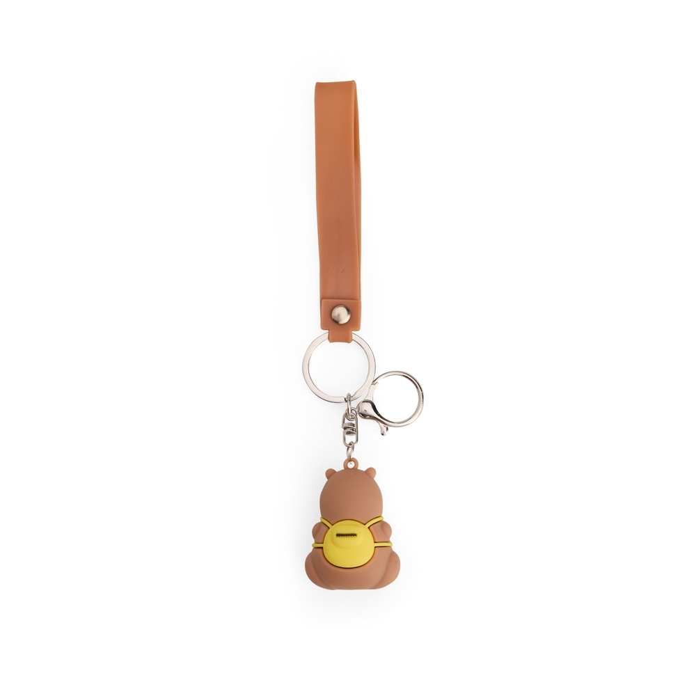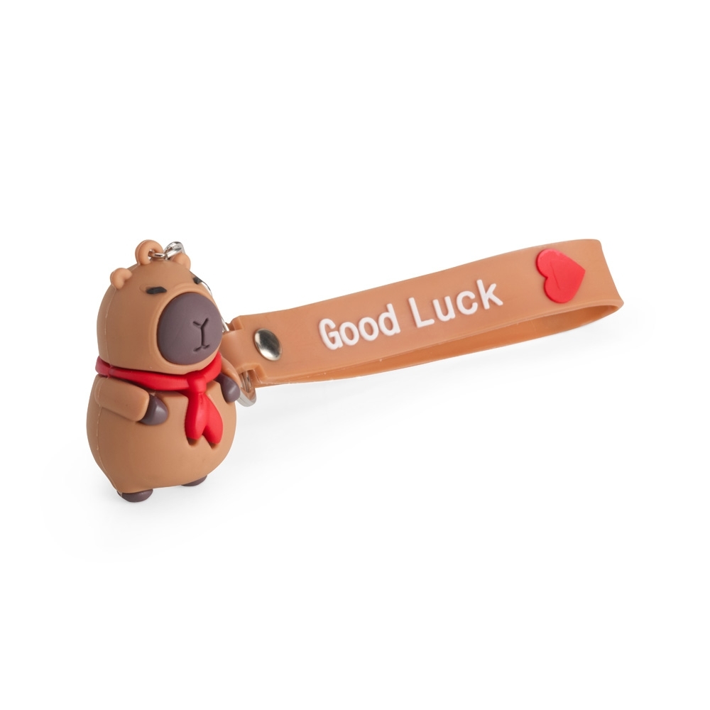 Chaveiro com textura emborrachada e em formato de capivara, acompanhado de argola e mosquetão metálicos e correia flexível.