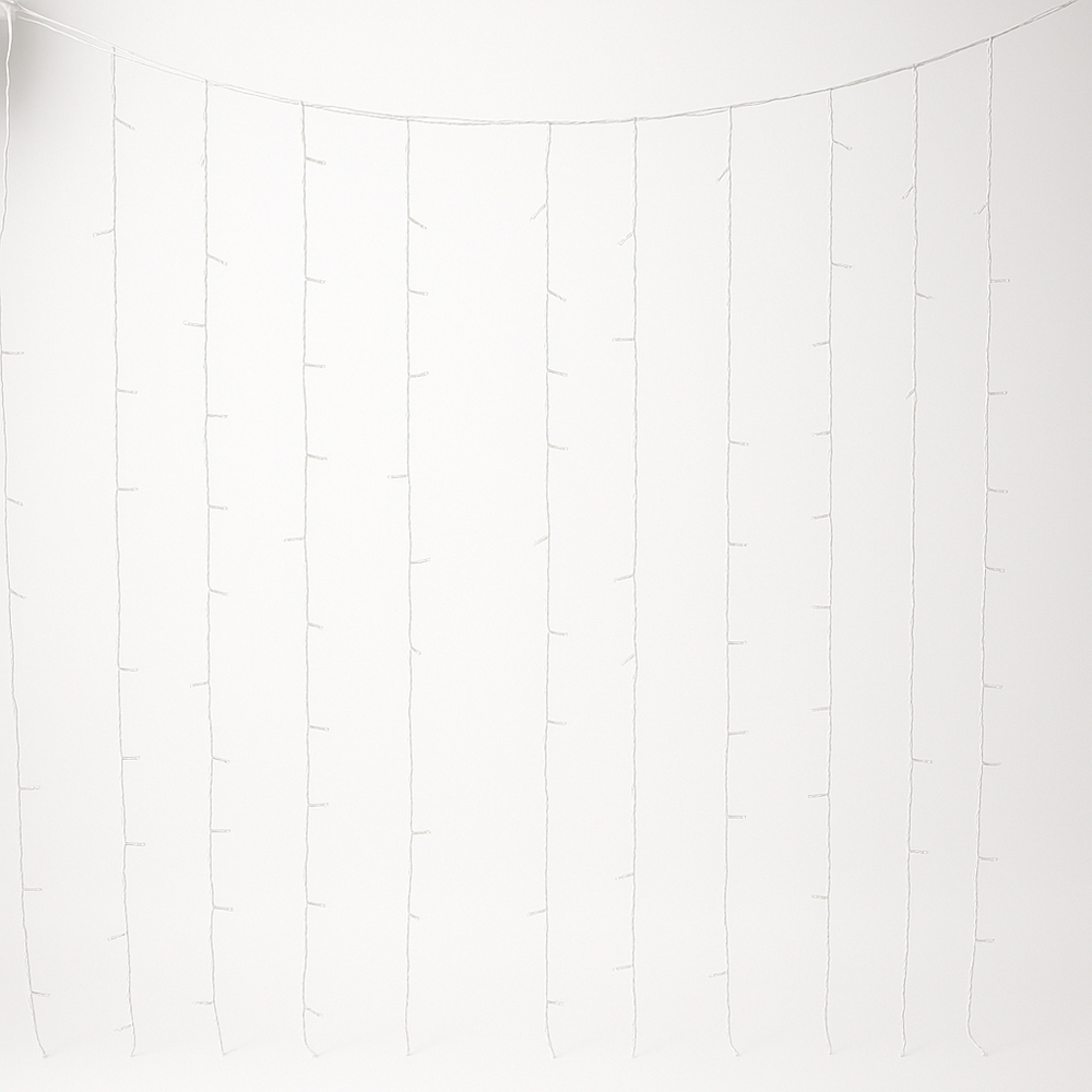 Cortina pisca-pisca com 300 LEDs dispostos em formato cascata ao longo de aproximadamente 3 metros de cabo. Possui cabo de alimentação 127V e adaptador para conexão com outros conjuntos.