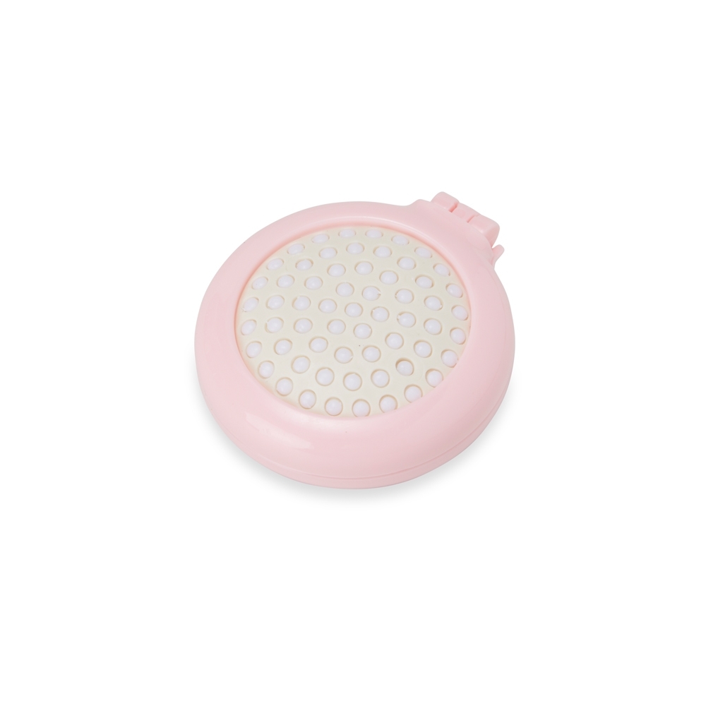 Escova plástica com acabamento leitoso e espelho interno de vidro sem aumento. Possui cerdas retráteis macias que massageiam o couro cabeludo enquanto penteiam os fios de cabelos.