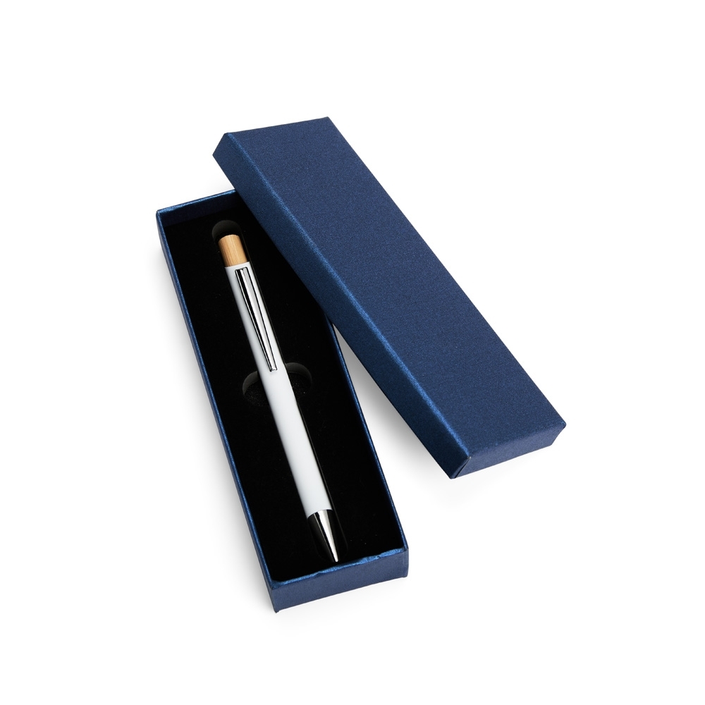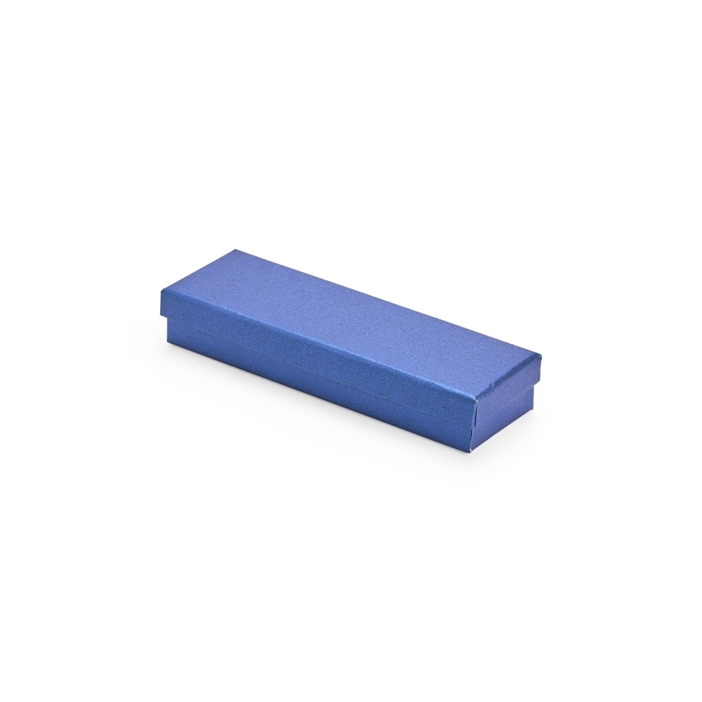 Estojo em papelão e revestimento removível de duas camadas em espuma com espaço para guardar uma caneta ou lapiseira.