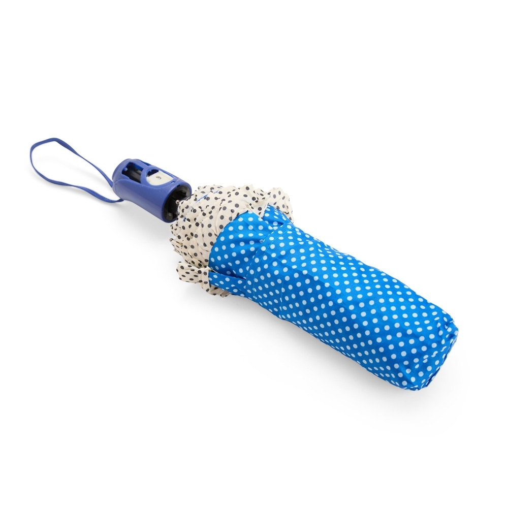 Guarda-chuva em poliéster com abertura automática por acionamento de botão. Possui estrutura metálica com oito varetas e pegador em plástico com alça de nylon fixa na ponta. Acompanha capa protetora.