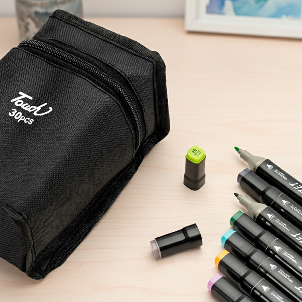Kit com 30 canetas marcadoras feitas em plástico com pontas duplas: uma fina e outra chanfrada. Acompanham bolsa com alça e fechamento em zíper para transporte.