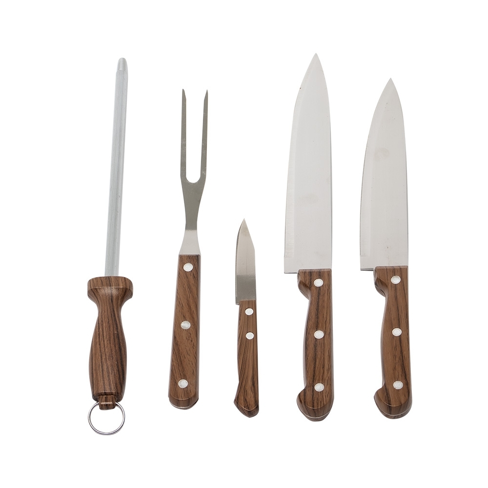 O kit perfeito para os verdadeiros amantes de churrasco! Composto por 5 peças em inox com cabos plásticos simulando madeira, nosso kit inclui três facas, sendo de 7”, 6” e 3” polegadas, além de um garfo e uma chaira, todos acomodados em um prático estojo de nylon, ideal para transportar facilmente para qualquer lugar.