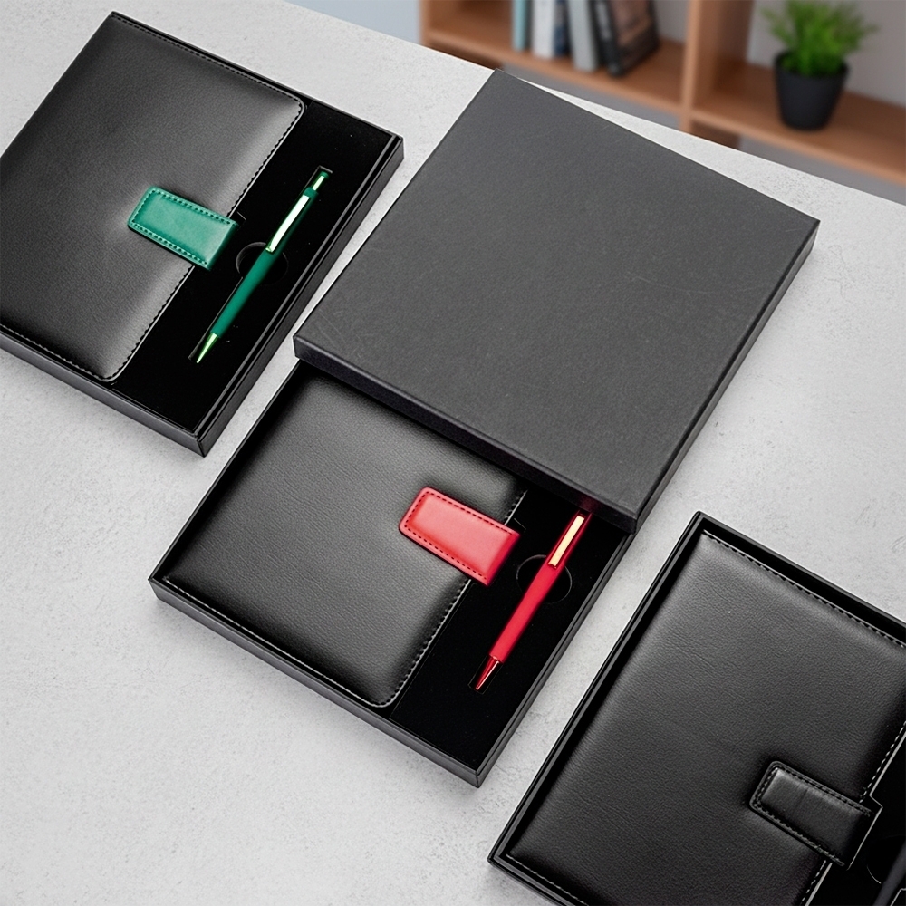 Kit executivo com duas peças, composto por uma caderneta de capa em couro sintético com fechamento magnético e cerca de 80 folhas pautadas, e uma caneta em metal com detalhes em plástico, ponteira emborrachada para uso em dispositivos touchscreen e carga esferográfica azul de 1,0 mm. Acompanha uma caixa de papelão com berço em espuma para a caneta.