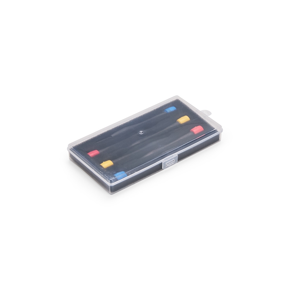 Kit de ferramentas com seis chaves com cabo plástico e pontas metálicas. Contém quatro chaves de fenda e duas chaves Phillips com pontas em tamanhos diferentes. Acompanha estojo plástico com espuma removível para acomodar as peças.