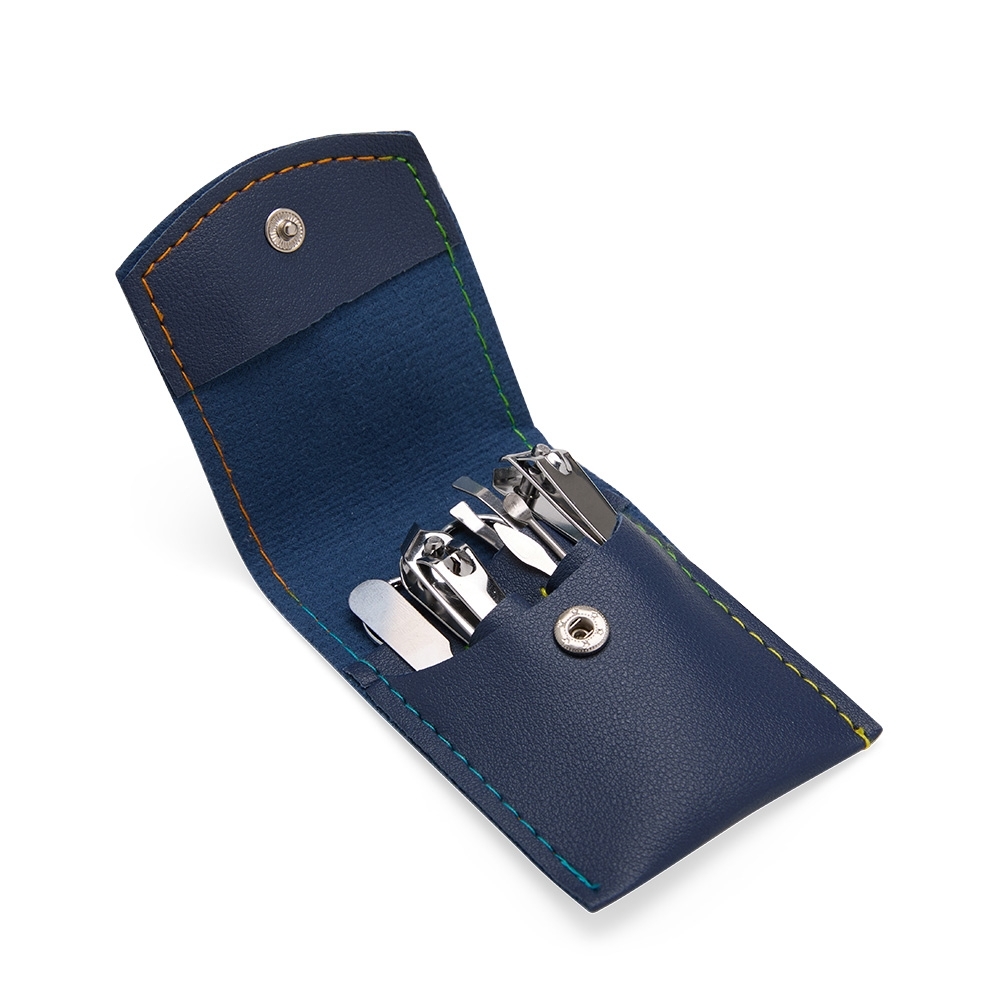 Kit manicure 7 peças em estojo de couro sintético. Contém: tesoura, 2 cortadores de unha, pinça, lixa, empurrador de cutícula e espátula para ouvido.