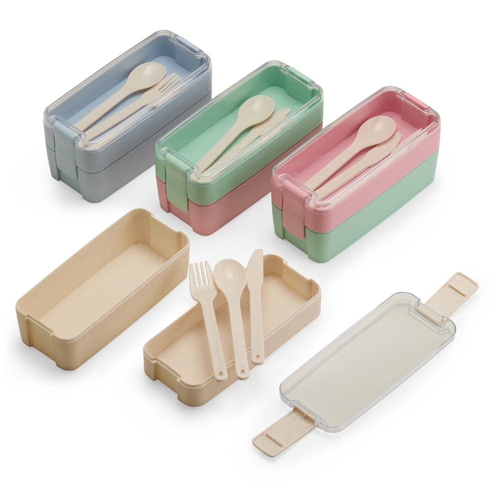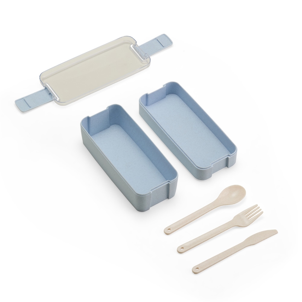 Marmita dupla em plástico polipropileno (PP). Apresenta dois potes com encaixe vertical e capacidade máxima combinada de 750ml. A tampa hermética em poliestireno (PS) possui travas laterais que mantêm ambos os potes unidos. Acompanha garfo, faca e colher em plástico.