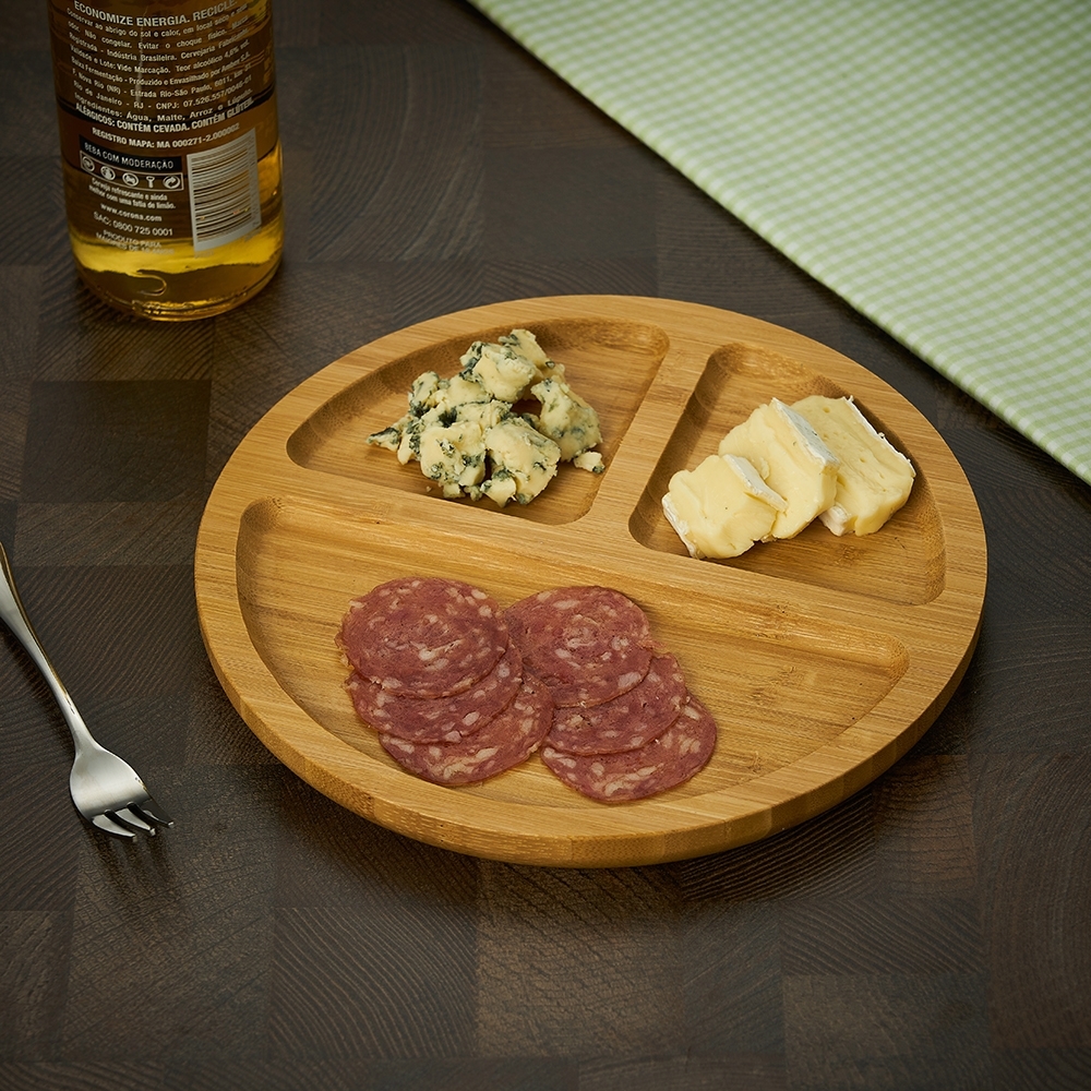 Petisqueira de bambu pequena com 3 divisórias.