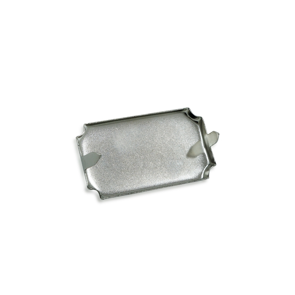 Plaquinha metálica para personalização. Possui acabamento fosco, hastes laterais com ponta na parte traseira, fure o tecido com as próprias hastes e dobre-as para fixação. Imagem com necessaire meramente ilustrativa.