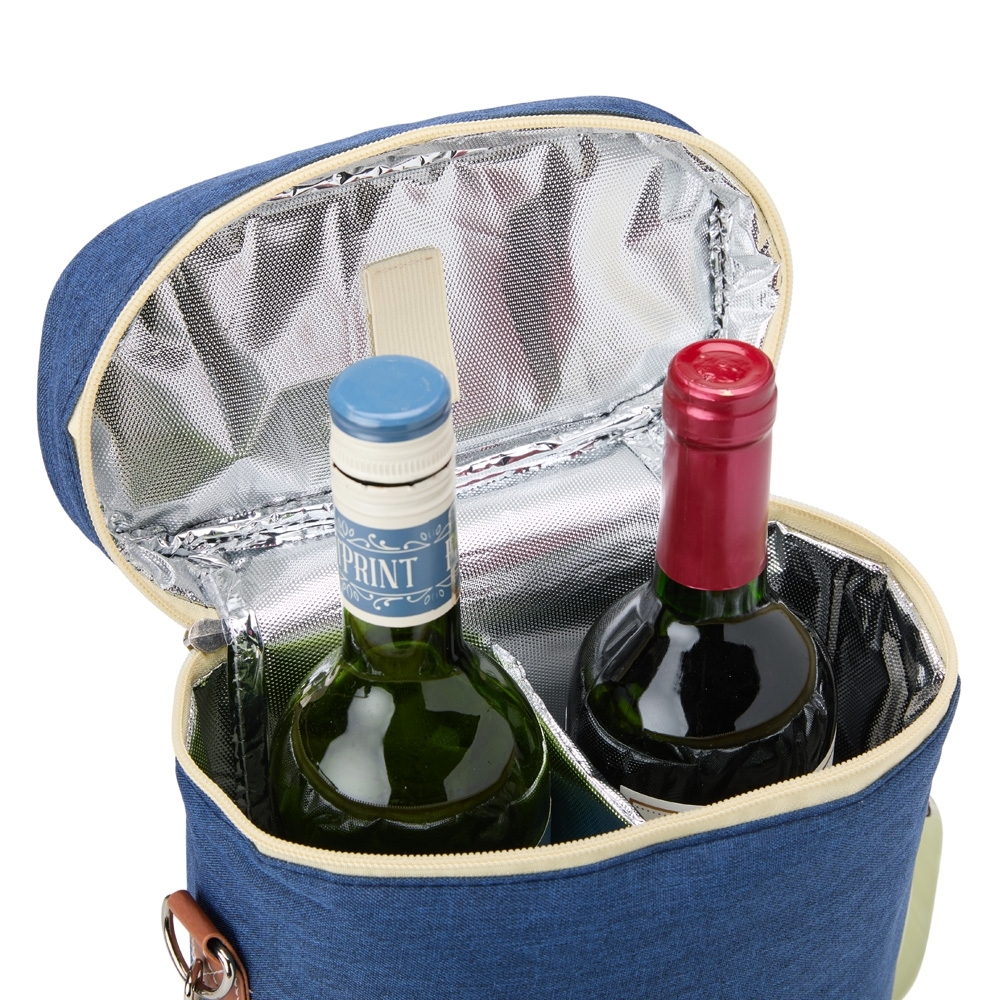 O interior possui divisória integrada, permitindo carregar duas garrafas com segurança e organização. Além disso, o porta-garrafas conta com suporte externo para abridor ou pequenos acessórios — perfeito para quem gosta de praticidade.
