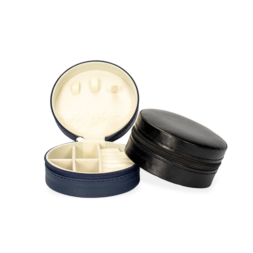 Porta-joias de formato redondo em couro sintético e fechamento em zíper. Possui revestimento interno aveludado, além de três pequenos ganchos, um bolso com elástico, divisórias removíveis e almofadas fixas para abrigar anéis.