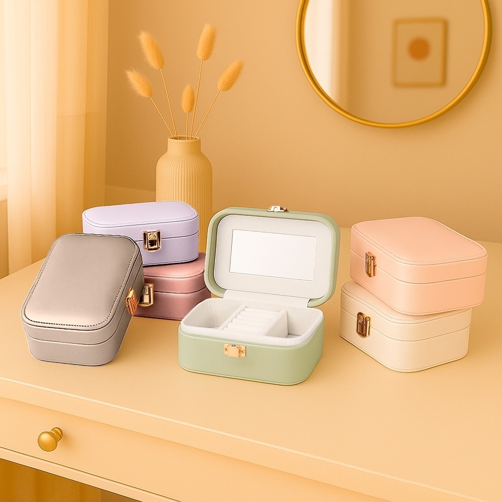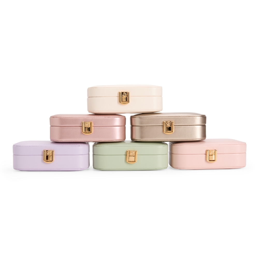 Porta-joias em poliuretano (PU) e revestimento interno em tecido aveludado. Conta com espelho interno, duas divisórias, repartição almofadada com ranhuras e trava de segurança.