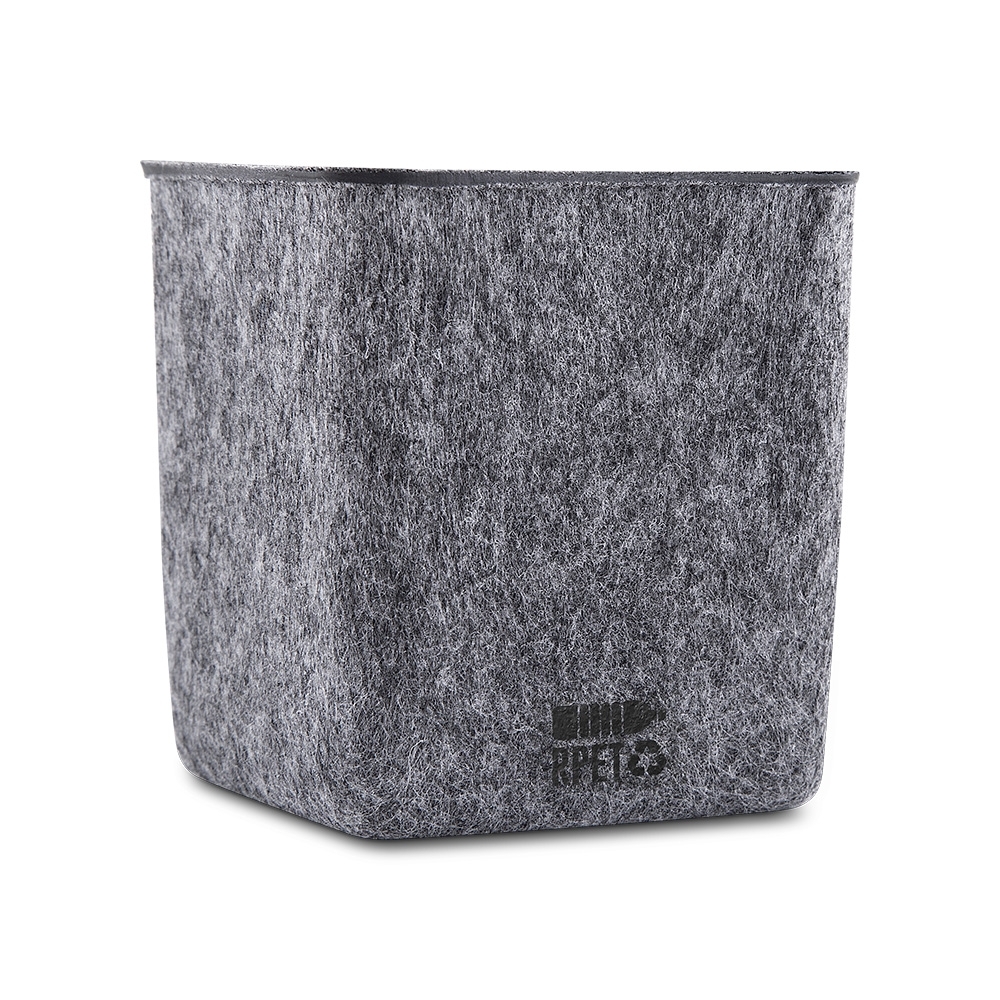 Porta-objetos com base em bambu com ranhura que funciona como suporte para celular, além de cesto removível em feltro reciclado.