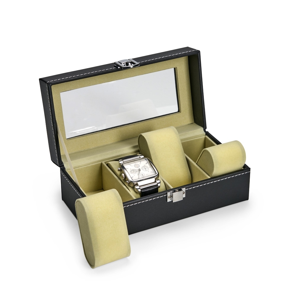 Porta-relógios com acabamento em couro sintético à base de PVC. Possui revestimento interno em veludo e quatro compartimentos fixos com almofadas removíveis de espuma. Conta ainda com visor transparente em vidro e trava de segurança para o fechamento do estojo.