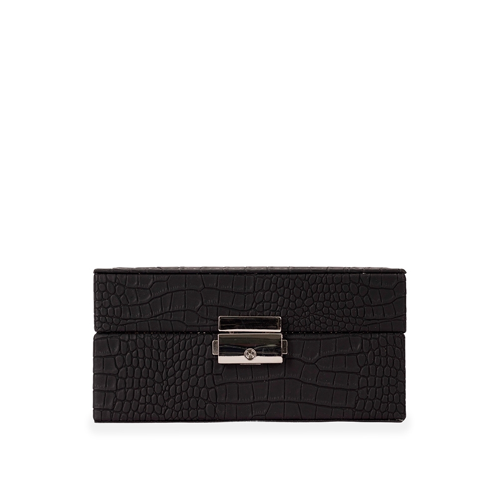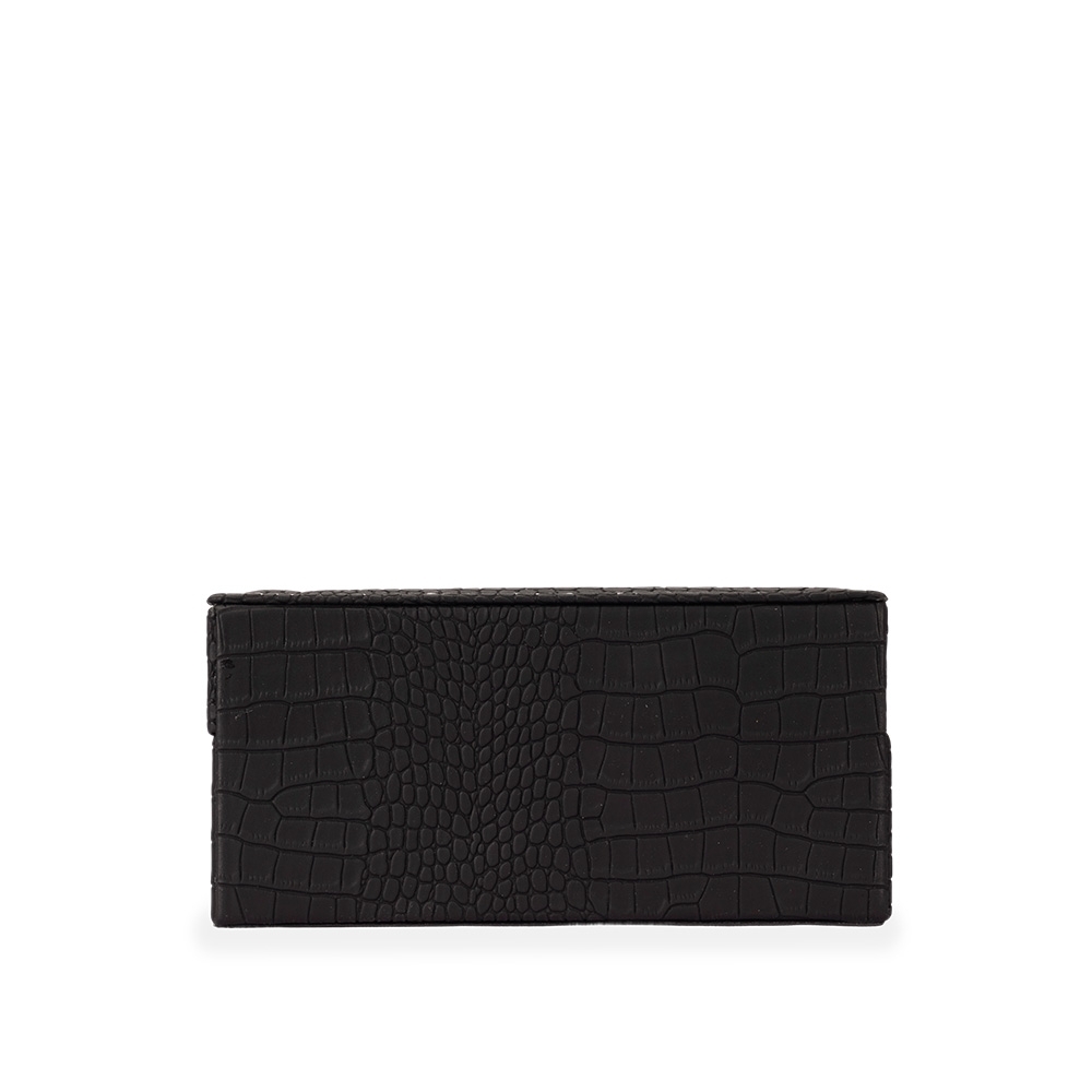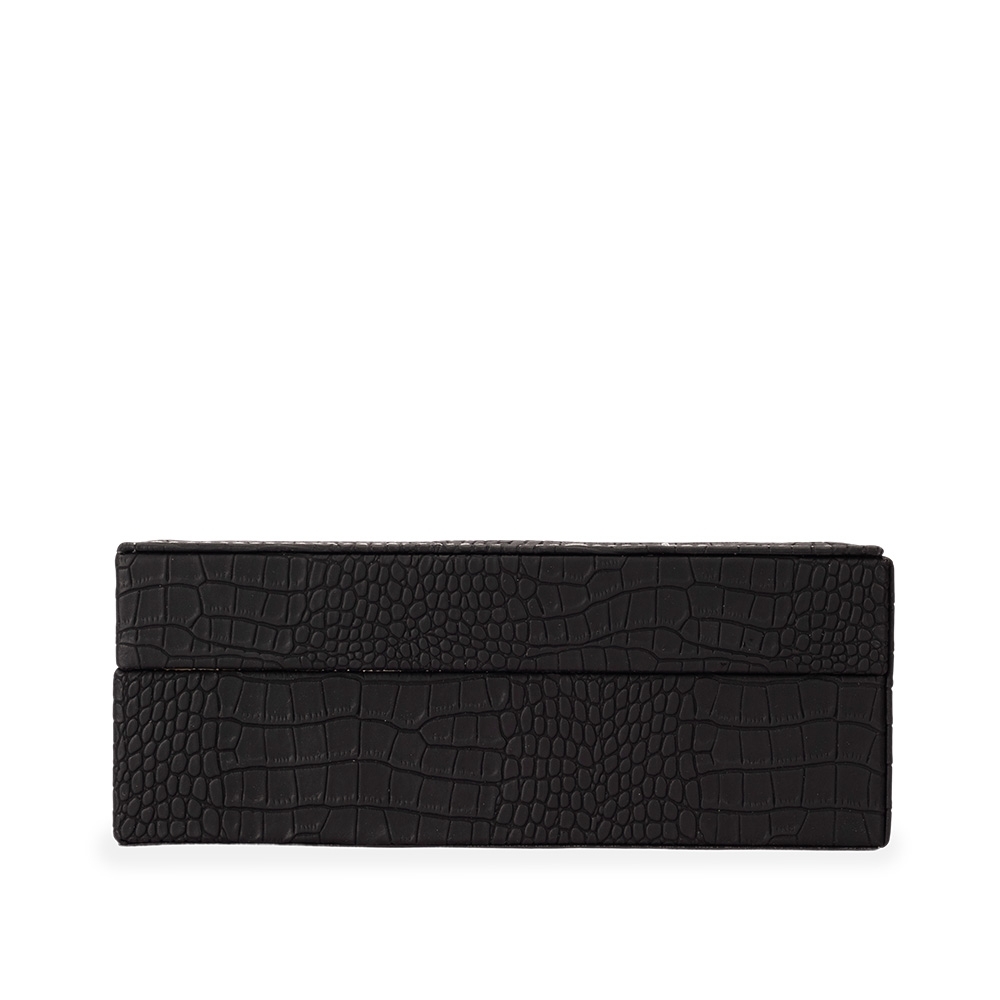 Porta-relógios com acabamento em couro sintético. Conta com revestimento interno em veludo e seis compartimentos: quatro com almofadas removíveis, um para objetos menores e outro almofadado com ranhuras. Possui tampa com visor em vidro e trava de segurança. Acompanha chave para fechamento do estojo.