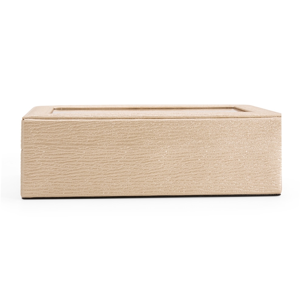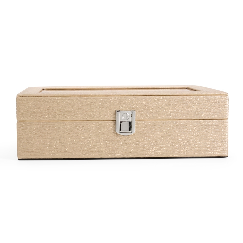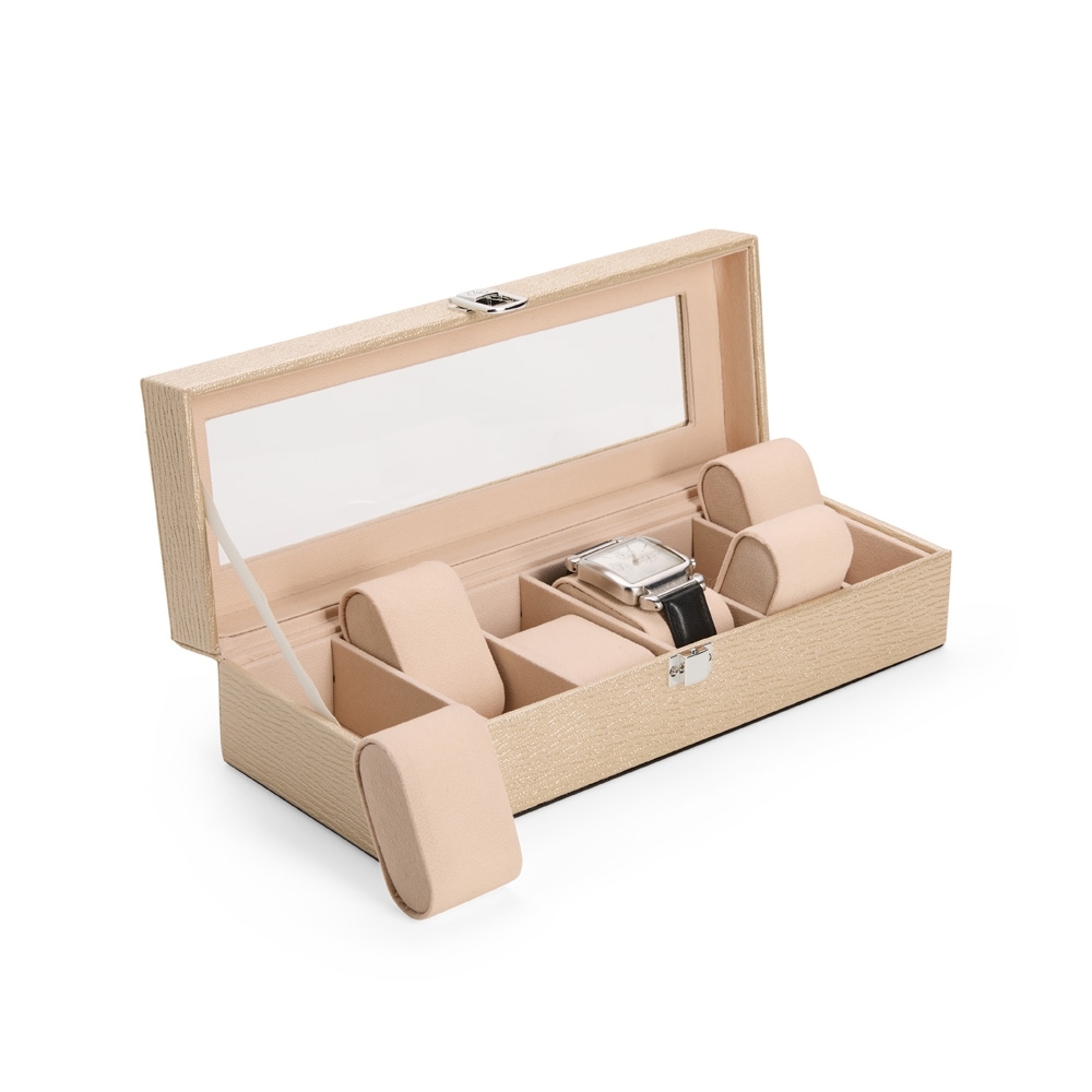 Porta-relógios com acabamento texturizado em couro sintético à base de PVC e revestimento interno em tecido aveludado. Possui seis divisórias com almofadas removíveis, visor de vidro e trava de segurança.