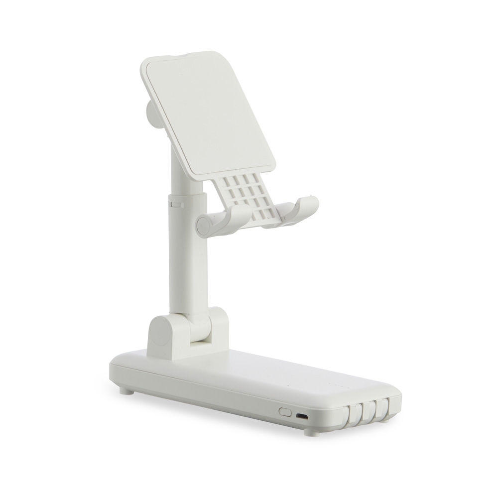 Power bank plástico de 5.000mAh com indicadores led de bateria e cabos acoplados: Tipo-C e V8. Acompanha cabo USB V8 e adaptador Lightning.