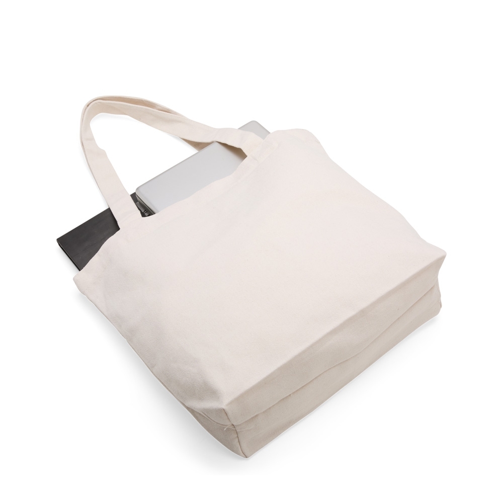 Sacola em lona resistente a respingos dágua. Possui duas alças fixadas por costura interna.