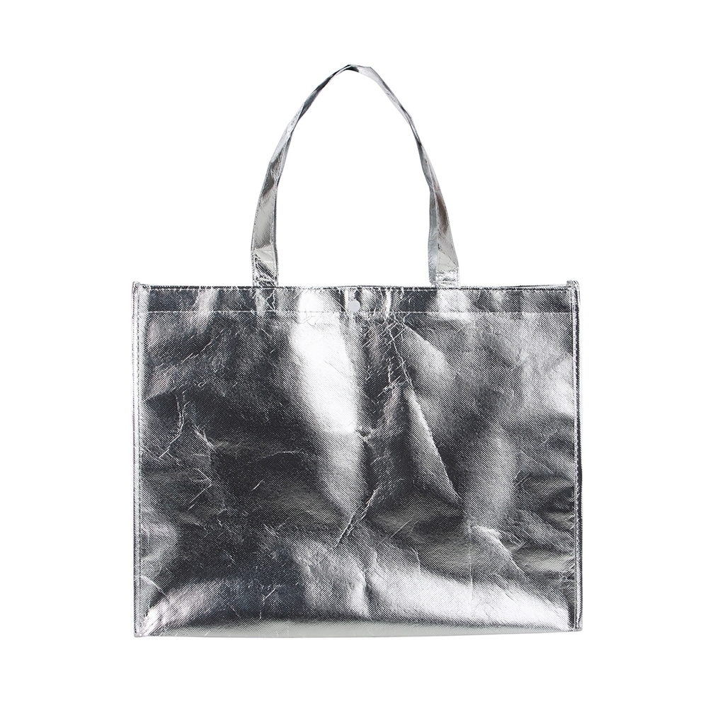 Sacola TNT metalizada 110g/m² com botão. Confeccionado em TNT com revestimento plástico laminado, parte superior possui botão plástico para fecho.