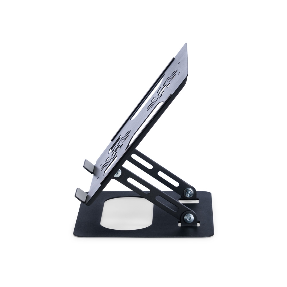 Suporte articulado para notebooks com ajuste em diversos ângulos para alcançar uma melhor posição de uso do aparelho com mais conforto e ergonomia nos mais variados ambientes, como escola, trabalho ou em casa. A construção funcional em aço do suporte e suas aberturas nas laterais e no centro ajudam na dissipação de calor do aparelho aliada com as tiras antiderrapantes nas laterais e nas bordas inferiores garantem um uso mais seguro e estável do eletrônico.