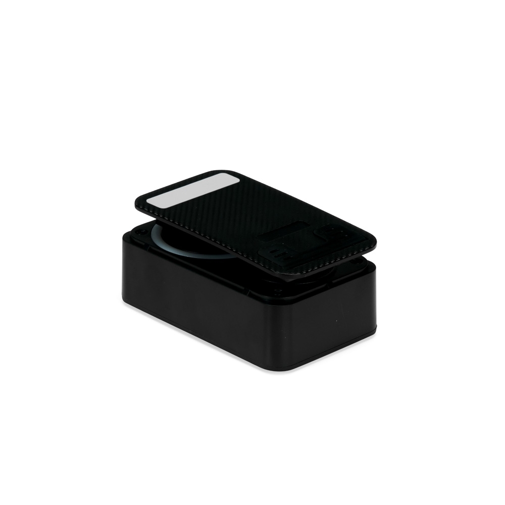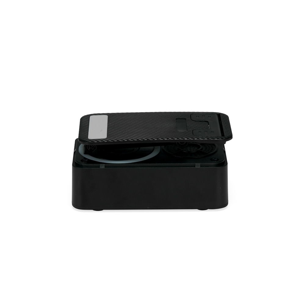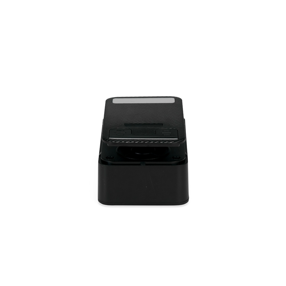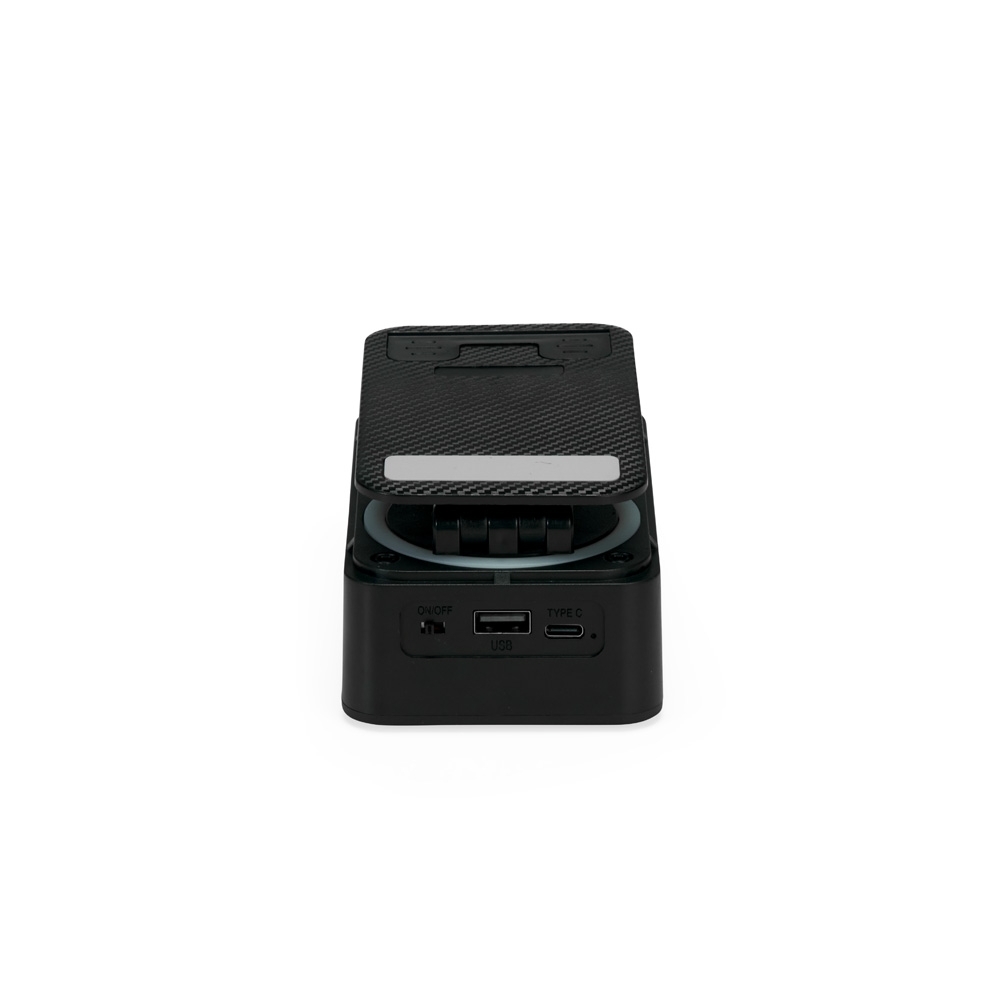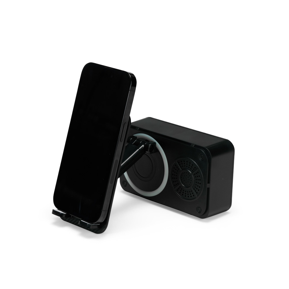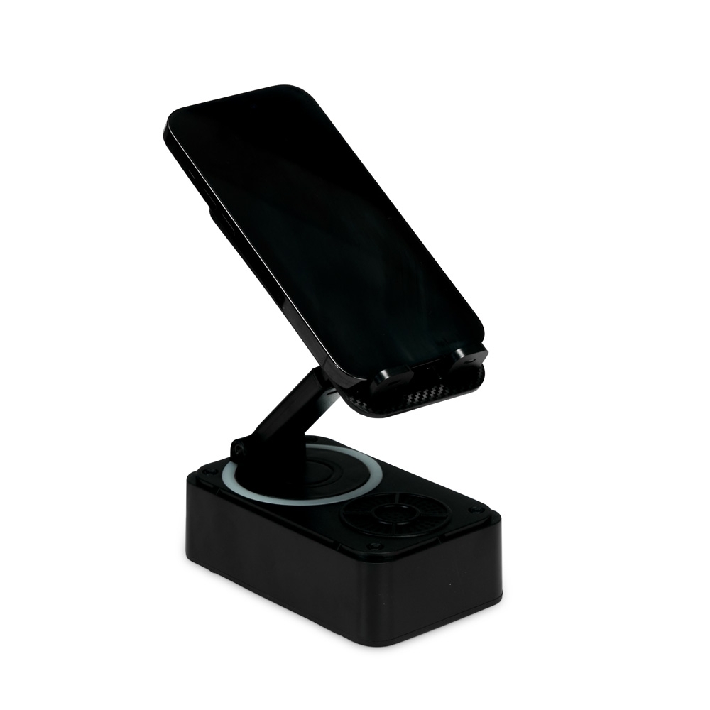 Suporte para celular com caixa de som Bluetooth, fabricado em plástico ABS. Ajustável em diferentes ângulos, com giro de 360º e faixas emborrachadas que garantem maior segurança. Possui conexão via Bluetooth e entradas USB-A e USB-C para carregamento. Acompanha cabo USB-C.
