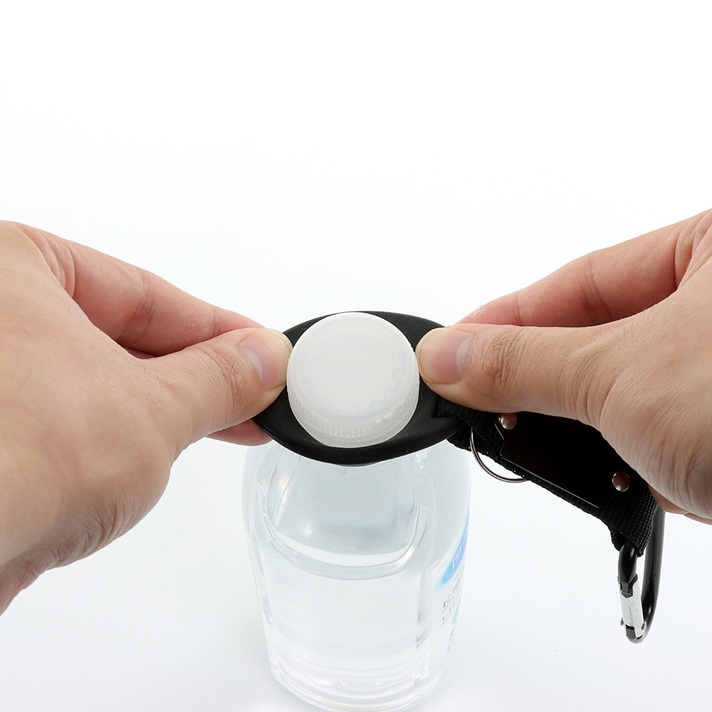 Suporte formado por uma alça de nylon ligada a um anel maleável, próprio para encaixe em bocais de garrafas PET. Em uma ponta, conta com o anel, e na outra, com mosquetão e argola para chaveiro.