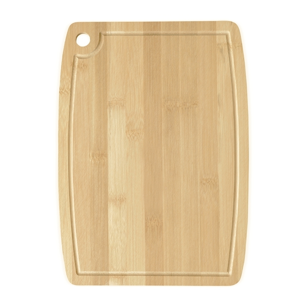 Tábua de corte em bambu com canaleta e acesso para gancho.