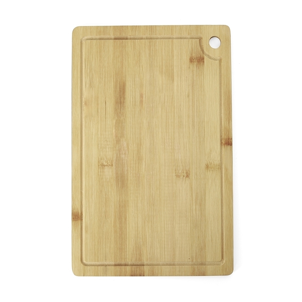 Tábua de corte em bambu com canaleta e acesso para gancho.